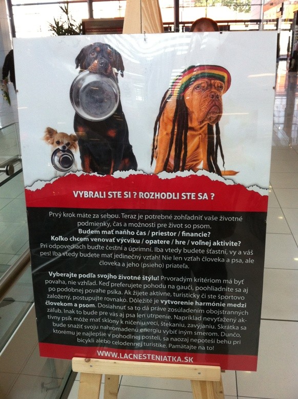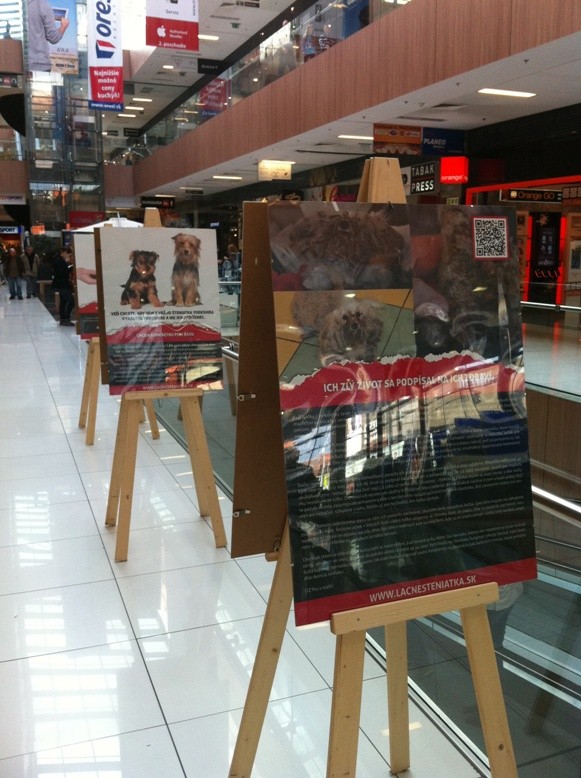 V obchodnom centre Mlyny v Nitre ste si mohli všimnúť výstavu ku kampani Lacné šteniatka. O čo vlastne ide? „Obchodovanie so zvieratami sa stalo hitom! Úprimne, vždy to hraničilo s princípmi etiky a humánnosti, no za posledné obdobie je situácia doslova alarmujúca. Milovníci zvierat a ochranári bijú na poplach! V dôsledku chýbajúcej legislatívy sa na Slovensku ročne rodia stovky až tisícky šteniat! BIZNIS!!!