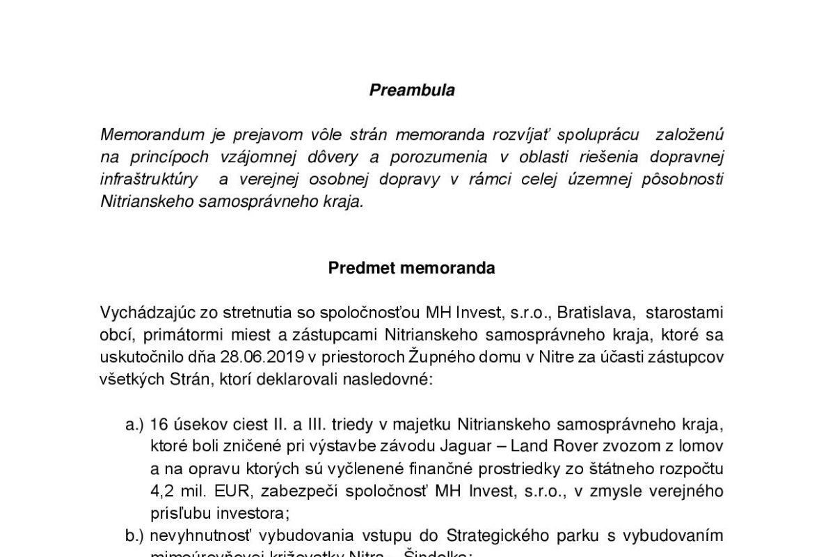 Memorandum hovorí o oprave ciest, ktoré boli poškodené počas výstavby automobilky Jaguar Land Rover v Nitre, vybudovaní 700-metrov dlhého úseku na ceste I/64 na Šindolke, výstavbe elektrifikovaného dvojkoľajového železničného prepojenia krajského Mesta Nitra s Mestom Bratislava cez Obec Trnovec nad Váhom, výstavbe okružnej križovatky na križovatke Nitra - Juh - Cabajská cesta (križovatka Čermáň), preložke cesty I/64 Nitra - Komjatice, výstavbe rýchlostnej komunikácie R8.
