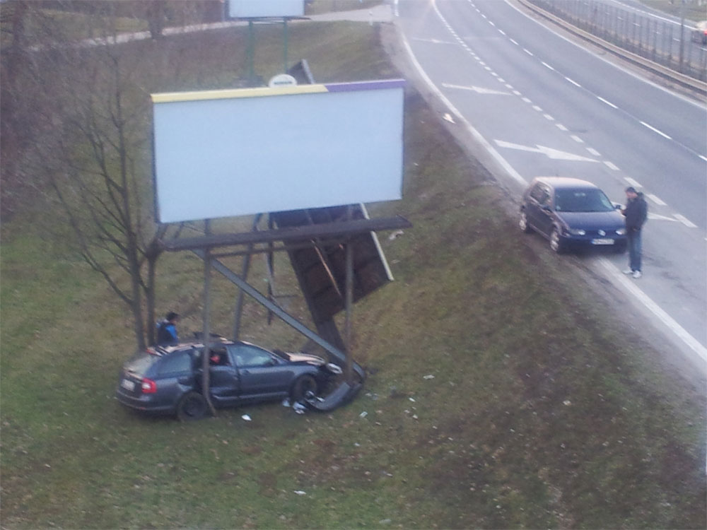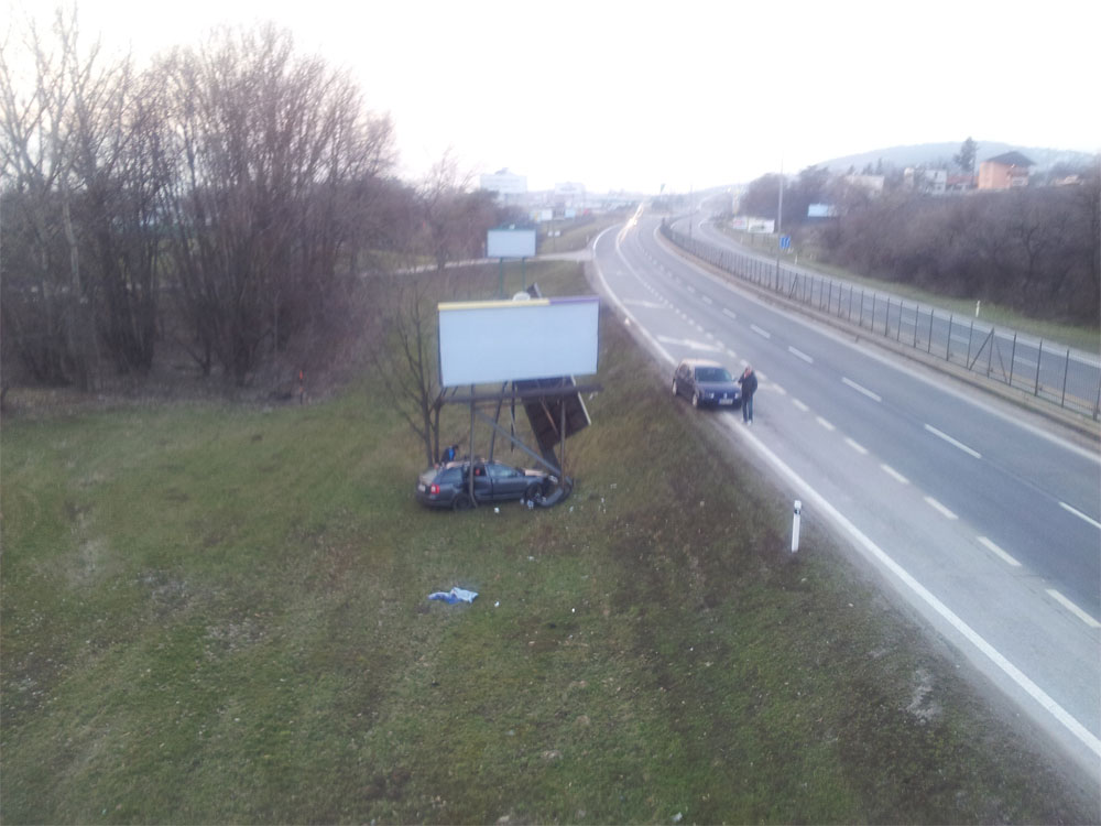 Vo večerných hodinách sa na severnom obchvate Nitry pod Zoborom stala dopravná nehoda. Zatiaľ z nezistených príčin zišiel vodič z krajnice a zastavil ho až billboard, ktorý stál pri ceste. Náraz bol taký silný, že billboard sa takmer celý zrútil a v krátkom čase bude musieť byť odstránený. Vodičovi prišli na pomoc záchranári, tí mu poskytli prvú pomoc a previezli ho do nemocnice na ďalšie vyšetrenia.