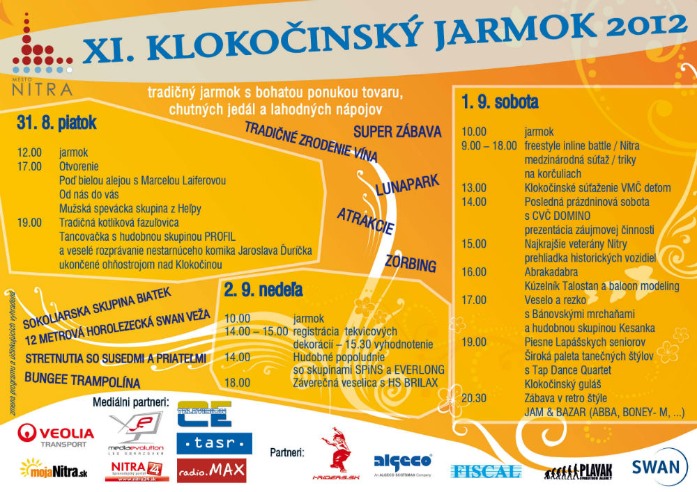 Cez víkend 31. augusta až 2. septembra ožije najväčšie nitrianske sídlisko tradičným v poradí už jedenástym Klokočinským jarmokom. Trojdňový program je mimoriadne bohatý a organizátor akcie, ktorým je Mesto Nitra, verí, že z pripravenej ponuky si každý návštevník vyberie podľa vlastnej chuti.Obľúbené kultúrno-spoločenské podujatie sa začína v piatok 31. augusta o 12.00 h otvorením tradičného jarmoku s bohatou ponukou tovarov, jedál a nápojov. Jarmočnú atmosféru svojim spevom spríjemní o 17.00 hodine speváčka Marcela Laiferová v programe Pod bielou alejou a po nej vystúpi mužská spevácka skupina z Heľpy, ktorá do Nitry prinesie krásne horehronské piesne. Večer sa bude podávať tradičná kotlíková fazuľovica, čo je vraj najčastejšie varená polievka na tomto nitrianskom sídlisku. Na programe je tancovačka s hudobnou skupinou Profil a zábava s vtipmi nestarnúceho komika Jaroslava Ďuríčka. Piatkový večer zakončí ohňostroj.