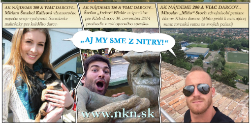 Obyvatelia Nitry môžu za minimálne 10 € podporiť miesto, kde žijú a pridať sa do 11. ročníka Klubu darcov Nitrianskej komunitnej nadácie (NKN). Nadácia spolu s osobnosťami Miroslavom „Miňom“ Stochom, Miriam Šmahel Kalisovou a Štefanom „Itchom“ Pčelárom vyhlasujú výzvu pre Nitranov: