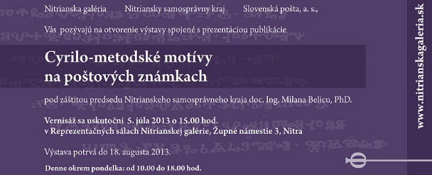 Nitrianska galéria pripravila v spolupráci so Slovenskou poštou, a. s., Poštovým múzeom v Banskej Bystrici, Českou poštou, s. p., a Poštovním muzeem v Prahe jedinečnú výstavu „Cyrilo-metodské motívy na poštových známkach“. Výstava sa koná pri príležitosti 1150. výročia príchodu sv. Cyrila a Metoda na Veľkú Moravu ako oficiálny sprievodný program cyrilo-metodských slávností v Nitre. Počas nich bude prezentovaná aj nová príležitostná poštová známka vydaná k tomuto výročiu ako spoločné vydanie s Českou republikou, Vatikánskym mestským štátom a Bulharskou republikou.