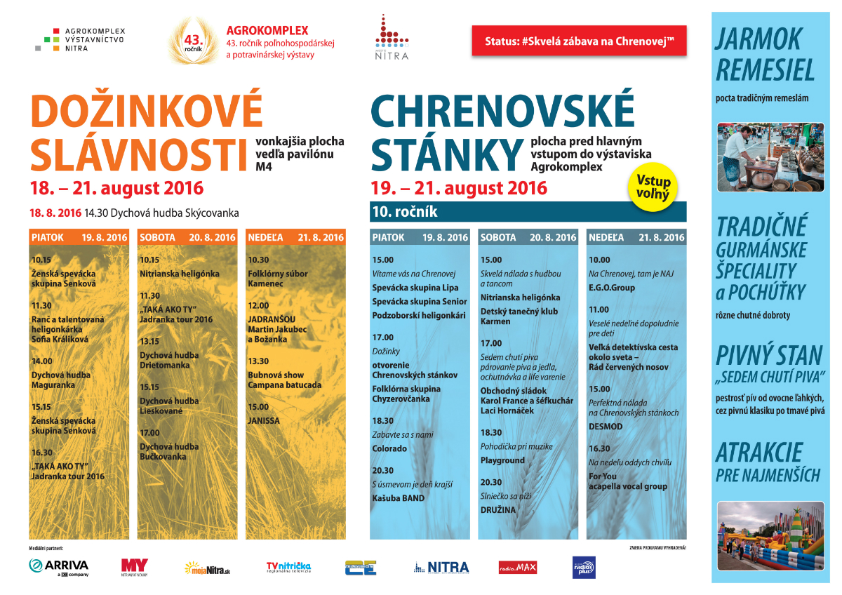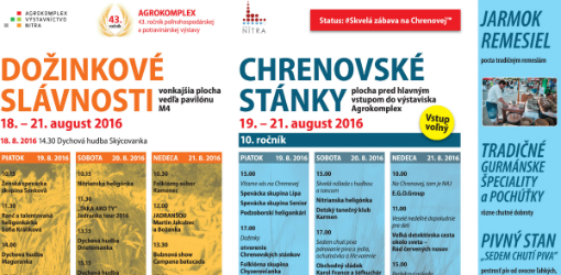Už po desiatykrát organizuje Mesto Nitra v dňoch 19. - 21. augusta súbežne s medzinárodnou poľnohospodárskou a potravinárskou výstavou Agrokomplex 2016 kultúrno-zábavné podujatie Chrenovské stánky. V priestore parkoviska, neďaleko hlavnej vstupnej brány na výstavisko, sa môžete prísť zabaviť, či nakúpiť si originálne výrobky na jarmoku remesiel. Postavený bude pivný stan „Sedem chutí piva“, kde sa budú čapovať moderné ľahké ovocné pivá, nájdete tu pivnú klasiku i tmavé pivá.