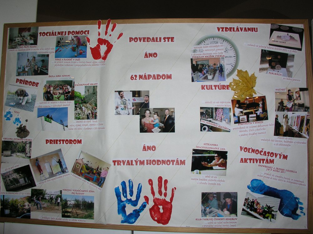 V piatok večer sa v nitrianskej synagóge uskutočnilo slávnostné podujatie Klub darcov 2011, na ktorom sa o dotácie Nitrianskej komunitnej nadácie uchádzalo 6 vybraných projektov. Svoje prezentácie odprezentovali EFFETA – Stredisko sv. Františka Saleského, Materské centrum Klokanček, Centrum Slniečko, n.o., Rodičovské združenie pri MŠ Nábrežie mládeže, ZŠ Fatranská a športové združenie Korfbal.