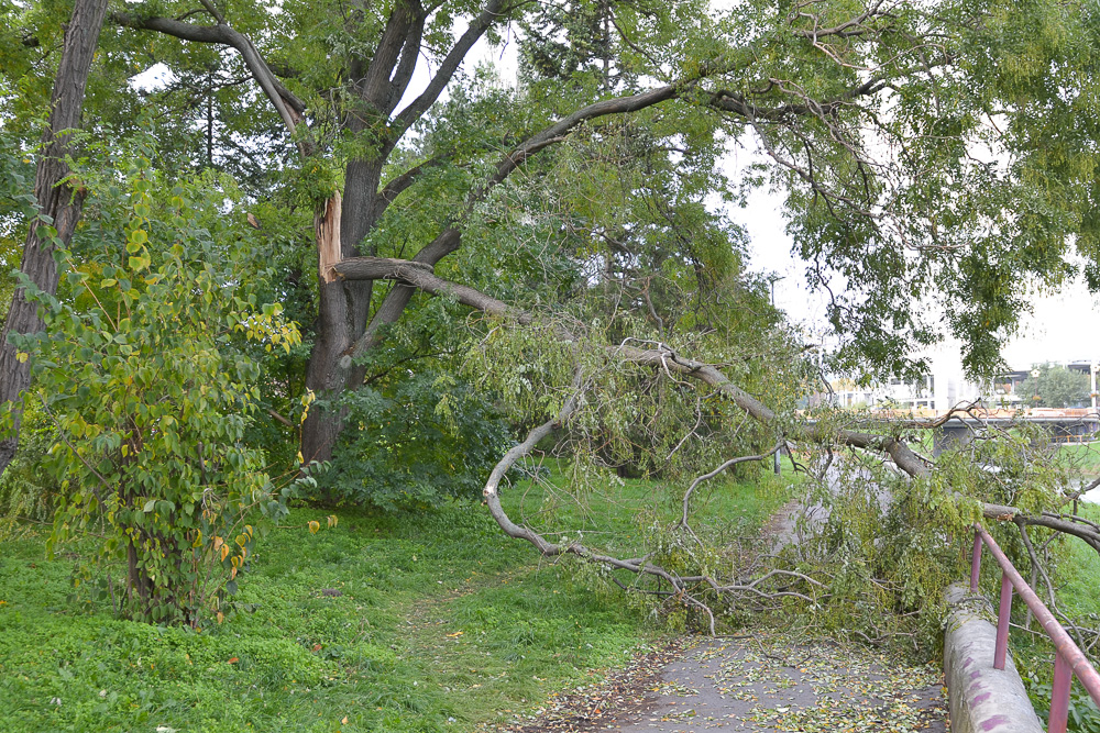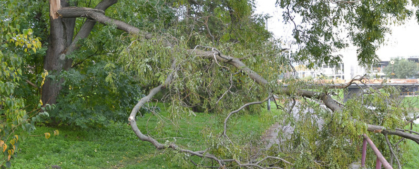 Strom, ktorý pravdepodobne zlomil vietor, nemá kto odstrániť. Bezpečnosť chodcov je ohrozená vzhľadom na to, že väčšia časť konára visí ešte stále nad zemou. Chodník sa tak stal pre ľudí a cyklistov nepriechodným. Odvážnejší môžu zlomený konár obísť po tráve pod ním. Tým sa však vystavujú riziku. Konár môže kedykoľvek spadnúť a spôsobiť im vážny úraz. Keďže sa na tráve už pomaly objavuje vyšliapaný chodníček, vyzerá to tak, že takto zlomený strom je tam už dlhšiu dobu a nikoho to netrápi.