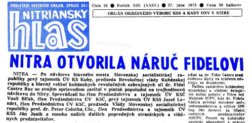 Bývalý kubánsky prezident Fidel Castro zomrel v piatok 25. novembra 2016 vo veku 90 rokov. Zaujímavosťou z histórie určite je, že v roku 1972 navštívil aj našu Nitru. Bolo to konkrétne v piatok 23. júna. Na návštevu Československa prišiel na pozvanie ÚV KSČ a vlády ČSSR. Okrem Nitry navštívil Bratislavu a Vysoké Tatry.