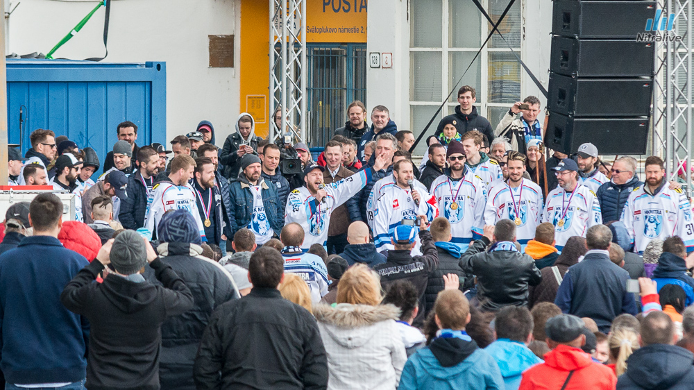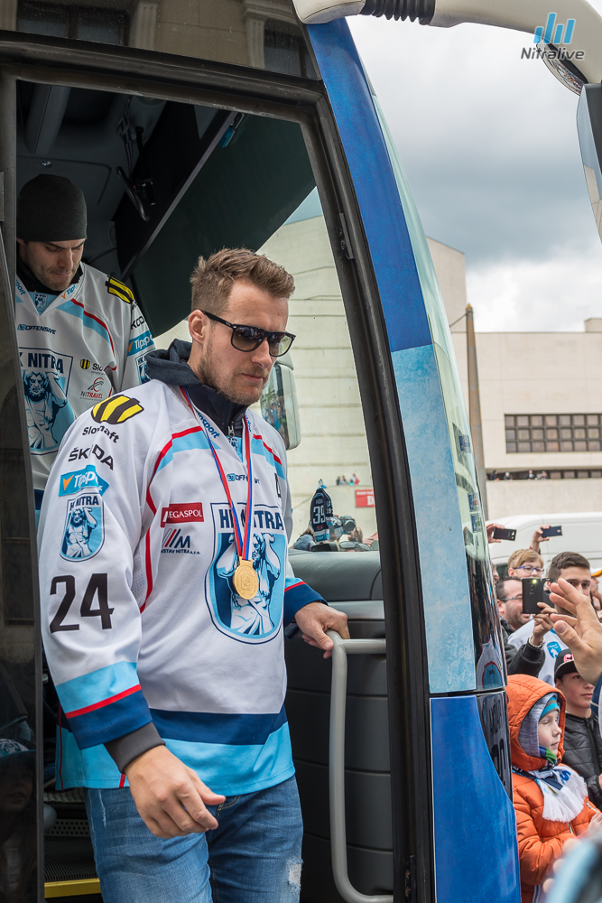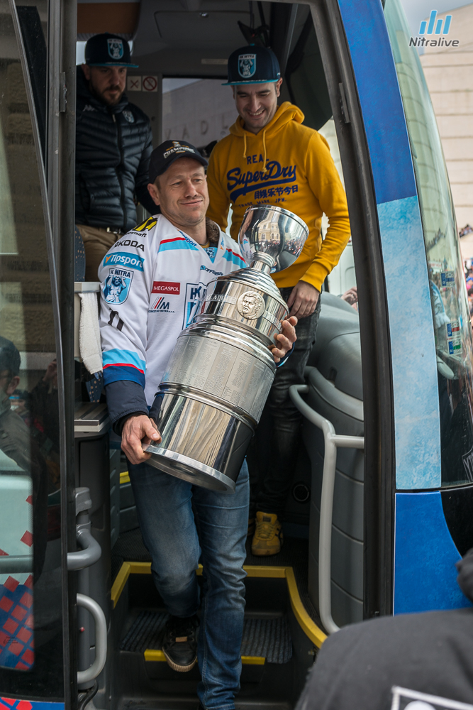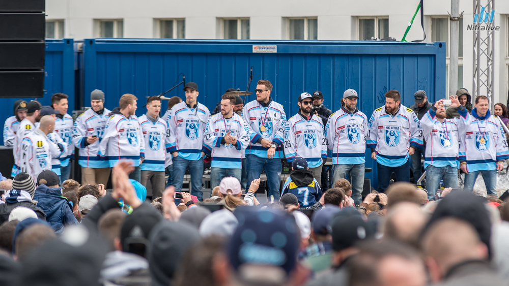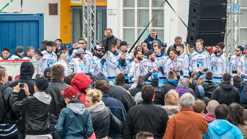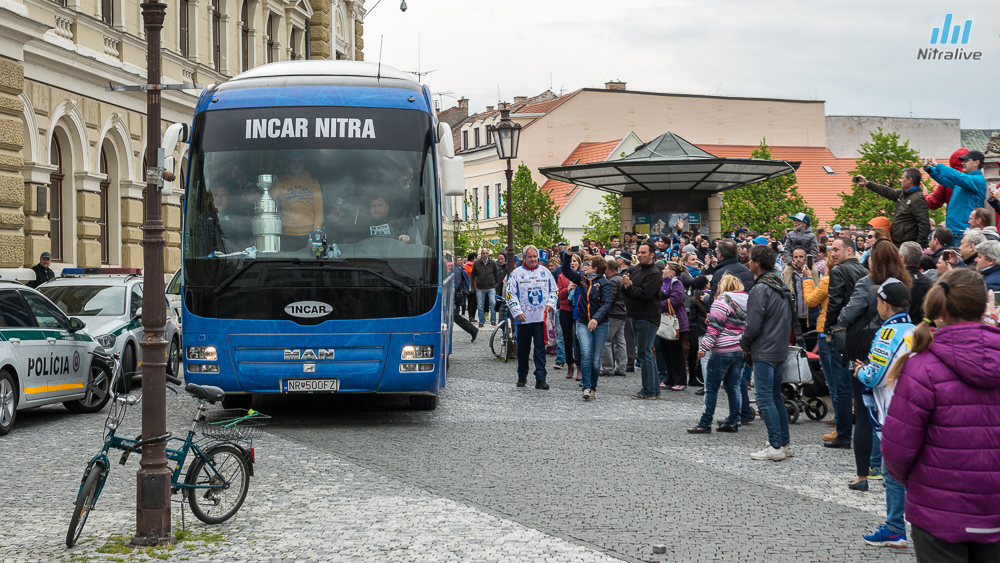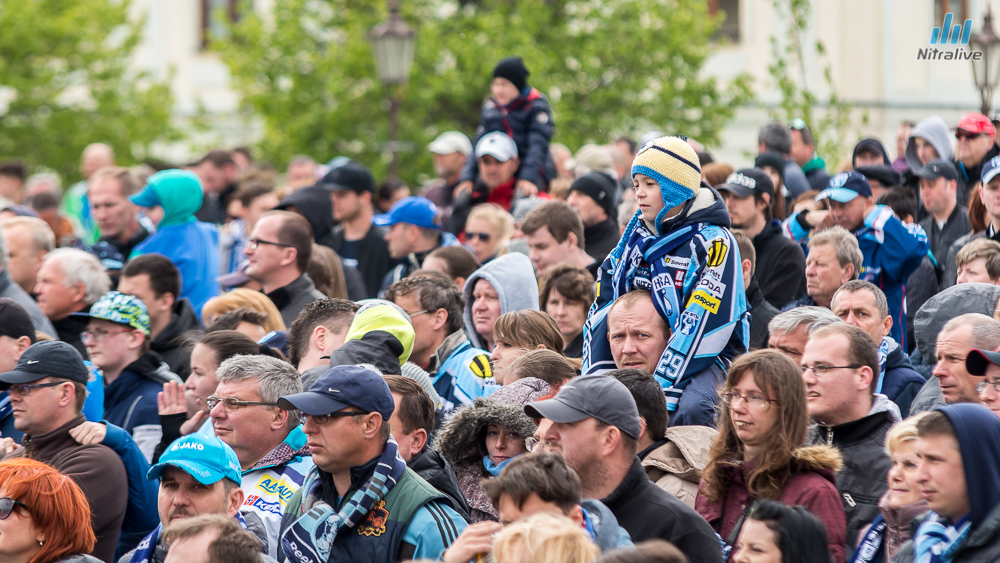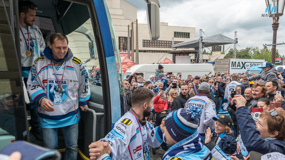 Hokejistov HK Nitra čakali dnes na Svätoplukovom námestí stovky fanúšíkov, aby s nimi oslávili historicky prvý titul majstrov Slovenska. Veľkolepú oslavu odštartovala nitrianska skupina Desmod. Po nich už nasledoval davom očakávaný príchod hrdinov spod Zobora. Autobus bol v okamihu obklopený ľuďmi, ktorí sa snažili dostať k hokejistom a potriasť im rukou.