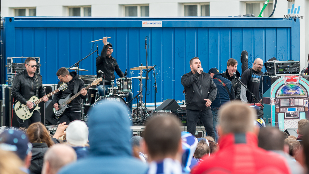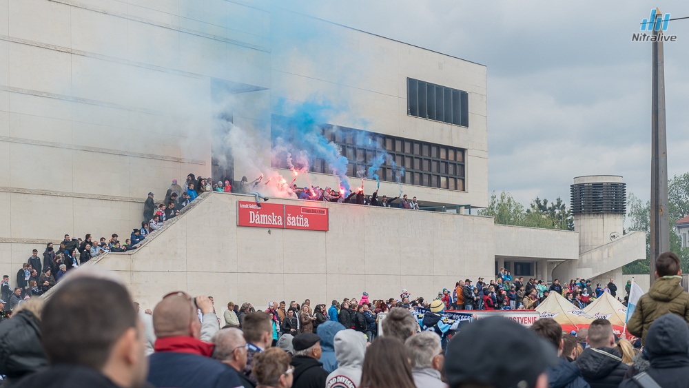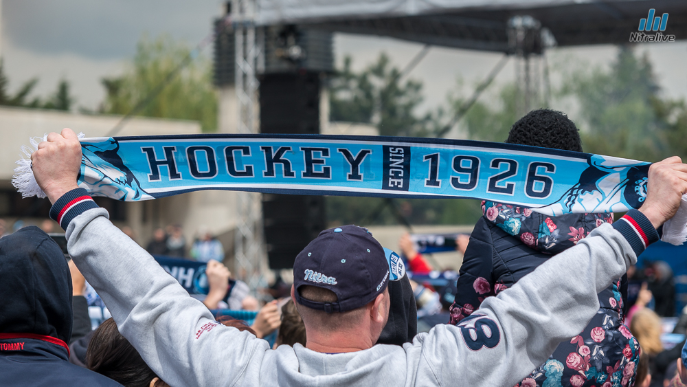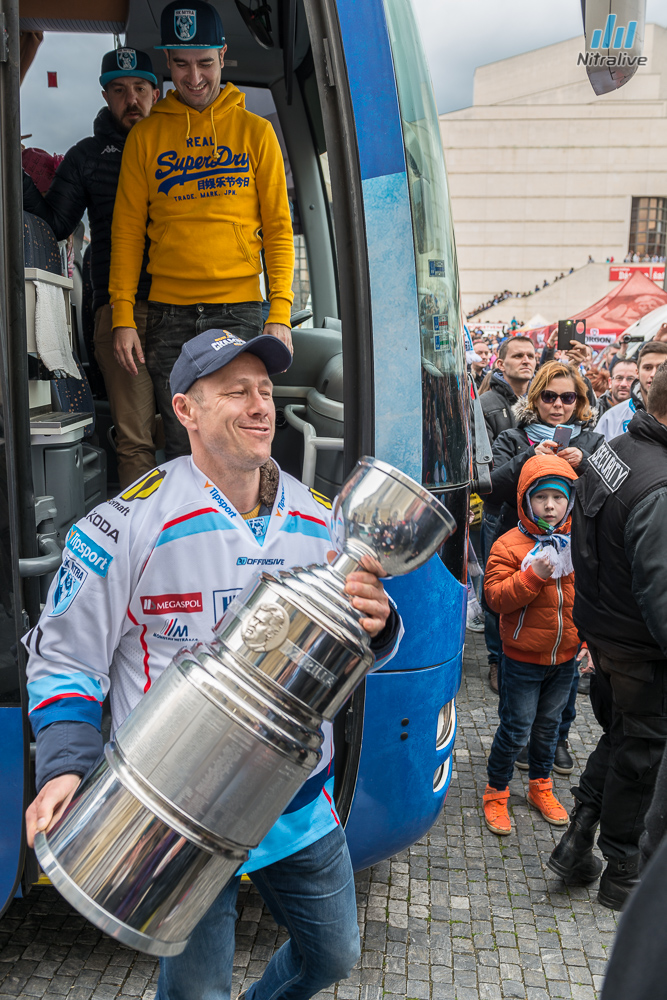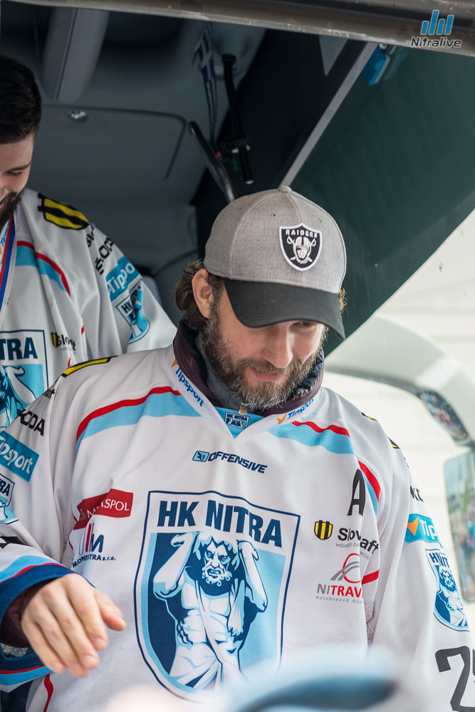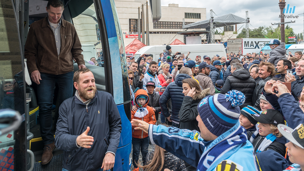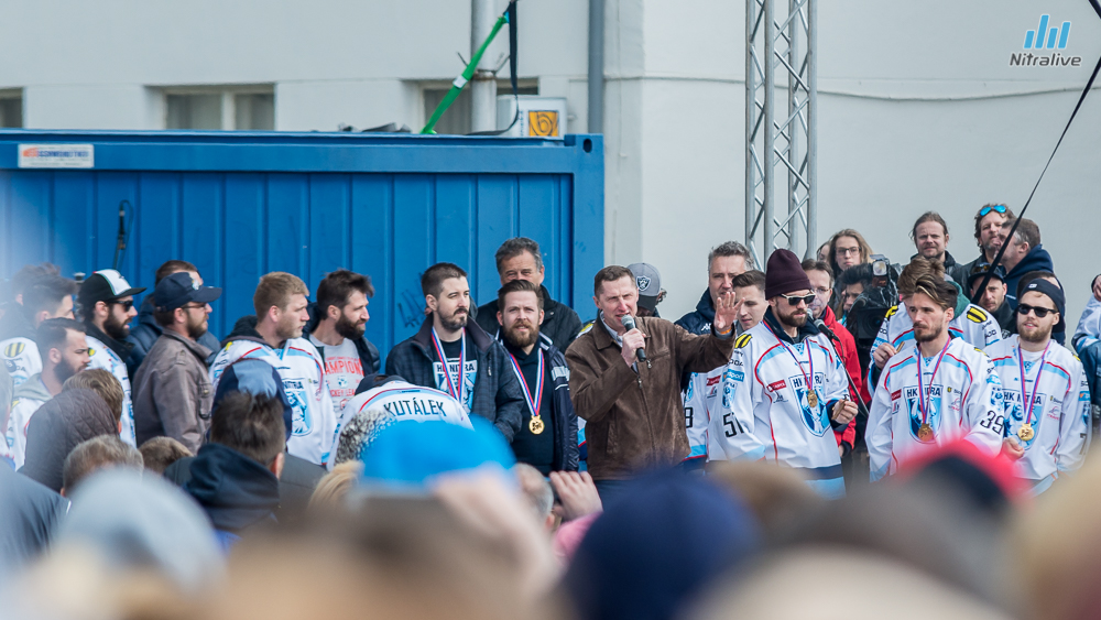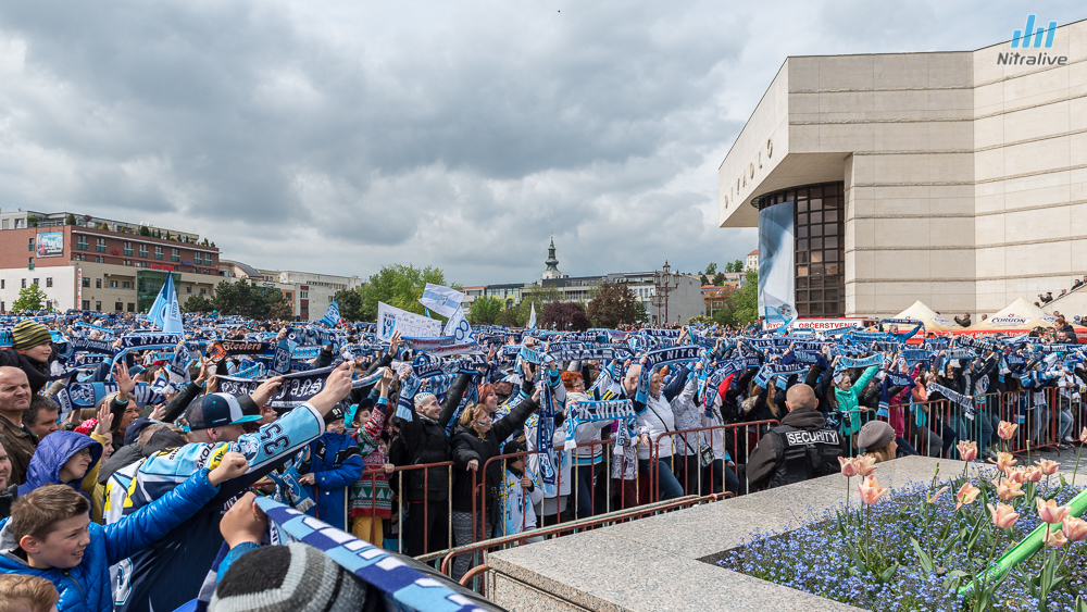 Hokejistov HK Nitra čakali dnes na Svätoplukovom námestí stovky fanúšíkov, aby s nimi oslávili historicky prvý titul majstrov Slovenska. Veľkolepú oslavu odštartovala nitrianska skupina Desmod. Po nich už nasledoval davom očakávaný príchod hrdinov spod Zobora. Autobus bol v okamihu obklopený ľuďmi, ktorí sa snažili dostať k hokejistom a potriasť im rukou.